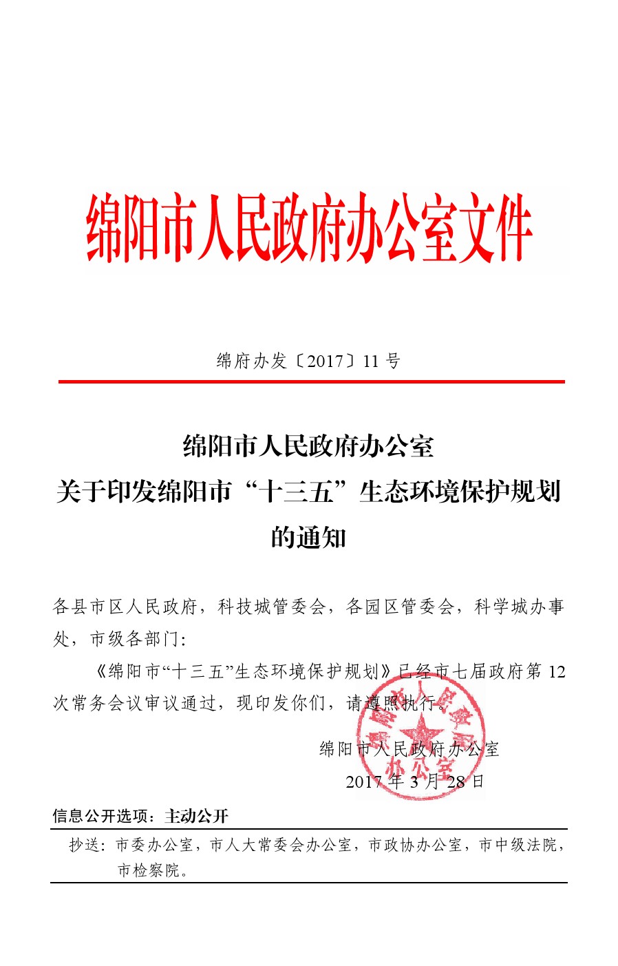 绵府办发〔2017〕11 号关于印发绵阳市“十三五”生态环境保护规划的通知