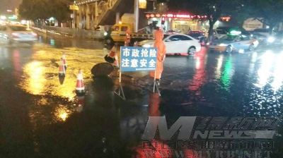 按照防汛抢险应急预案,市政设施维护中心组织人员奔赴城区景福花园、九洲大道、穿越龙门、飞云大道电信花园路段、绵吴路口、南山路口、一号桥及滨河路等30余处易积水路段进行值守。