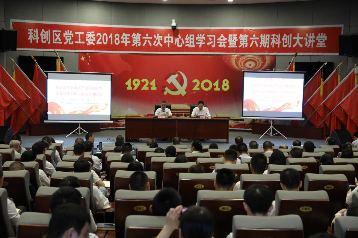6月29日,科创区召开2018年第六次区党工委中心组学习会暨第六期科创大讲堂,邀请市纪委副书记、市监委副主任任斌同志作党风廉政专题辅导报告。区党工委书记周钰主持会议并讲话;区党工委、管委会在家领导,副科级以上干部,区机关全体党员干部职工,各社区“两委”委员等近300人参加会议。