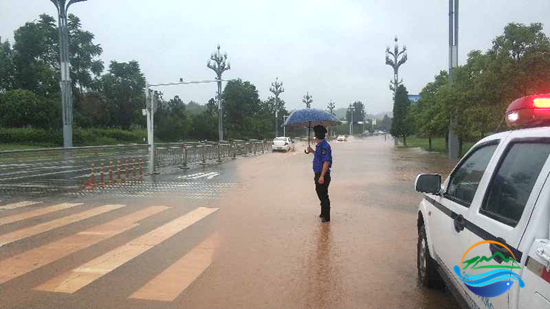 在防汛一线,绵阳市公安局仙海分局按照防汛减灾预案做出安排部署,出动全体民辅警,冒雨对绵梓路辖区路段、环库路段、及各个村社进行巡逻和安全疏导;对大树切断的迎宾大道,蔡家桥村道等路段、村社,进行重点救援;对因大雨产生山体滑坡路段、坑洼路段、积石路段设立了警戒标志,并在现场进行疏导。
